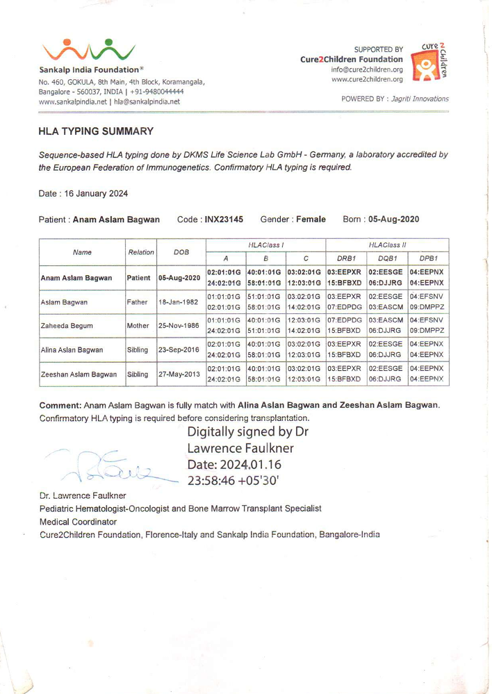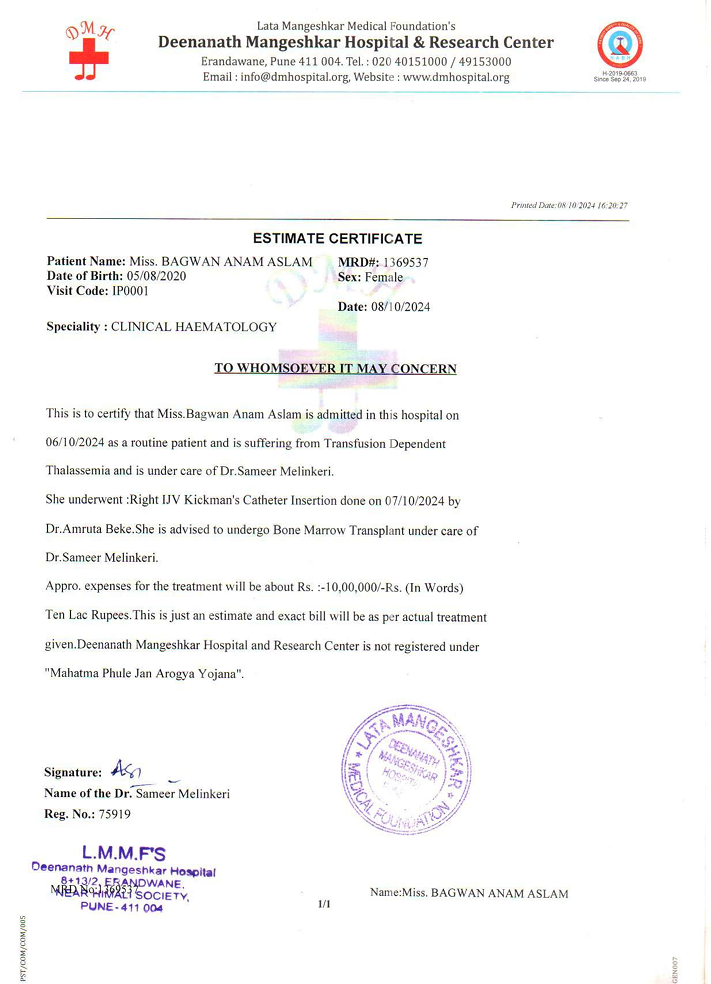 Anam Aslam Bagwan, a 4-year-old girl from Aurangabad, Maharashtra, is bravely fighting a life-threatening condition—Thalassemia Major, a severe genetic blood disorder often referred to as a form of blood cancer. In this condition, the body is unable to produce sufficient healthy blood, making lifelong blood transfusions necessary—each one bringing complications and risks. The only curative treatment for his condition is a Bone Marrow Transplant (BMT), and time is of the essence.